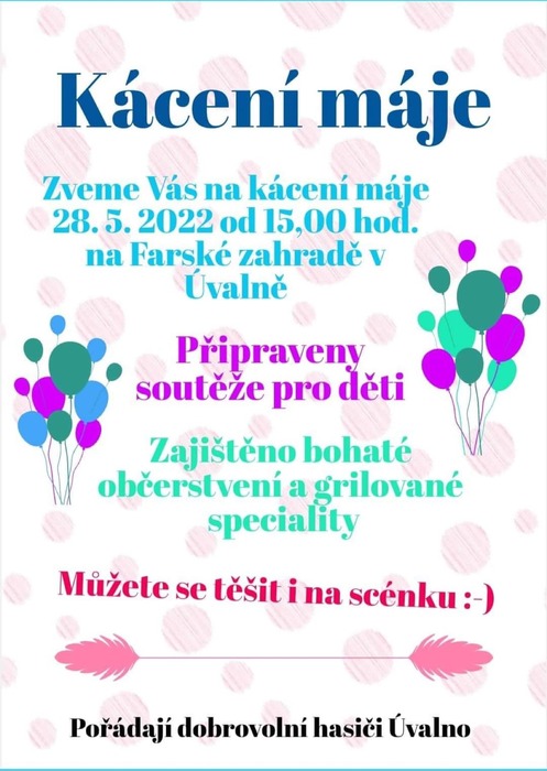 Zveme Vás na Kácení máje, které proběhne v sobotu 28.5. od 15 hodin na zahradě Fary. Jsou připraveny soutěže pro děti, občerstvení, grilované speciality. Zvou Hasiči Úvalno.